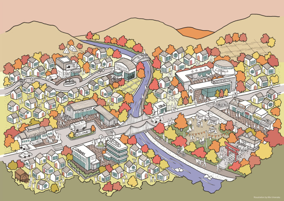 映画館、文化センター、大学、図書館、役場などWEBサイト上に現れた都市の中で動画をみたりサークルに入ったり、授業を受けるなど地域に関する様々なコンテンツや活動に触れることが出来る仕組みです。キービジュアルのイラストレーションを作成しました。