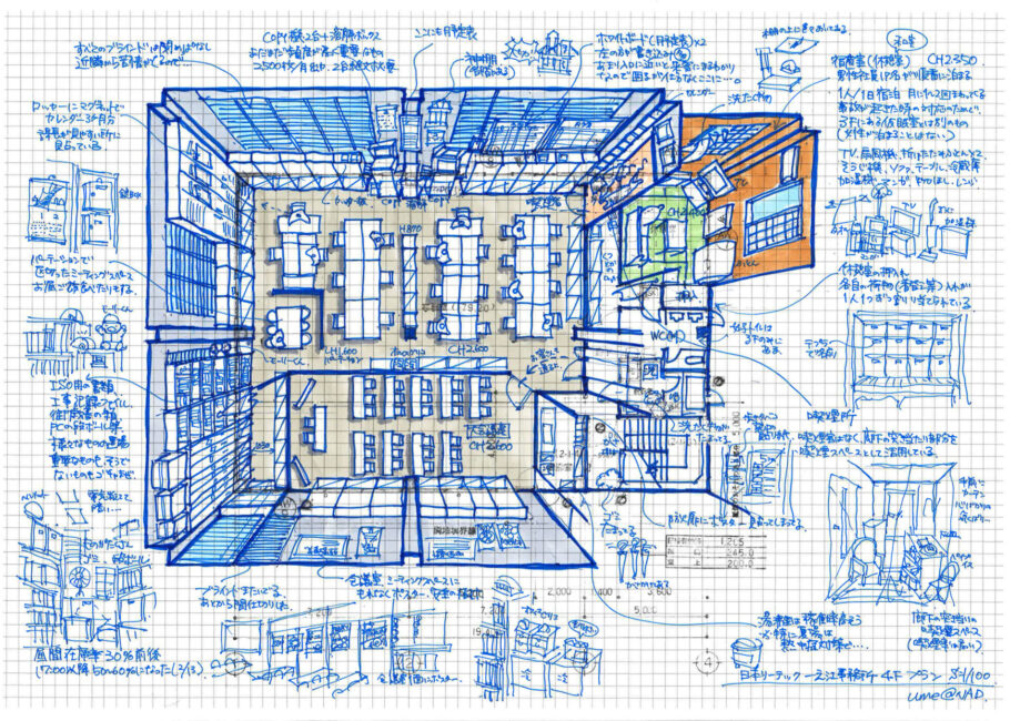 クライアントのリアルな働き方を知るため、各部門の工事現場や事業所の方々に密着取材し、工事作業中の同僚や協力者とのコミュニケーションの取り方や道具の整理整頓の仕方、事業所でのデスクやロッカー周りの運用方法などを徹底的に観察しました。