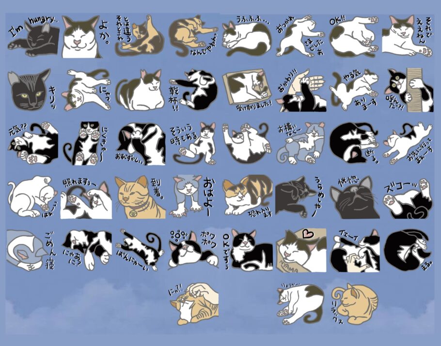 我が家のテラスに来る地域猫や知人・友人の愛猫などの寝姿をモデルに作成しました。クリエイターズスタンプから購入やプレゼントが可能ですので、お買い求めください。