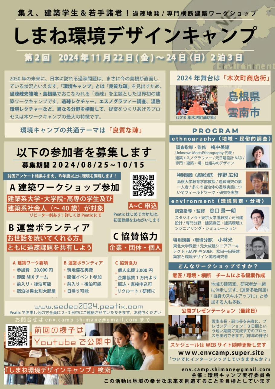 島根県建築士会長をはじめとした島根県で活躍する建築家と、島根大学から過疎研究者、大学生や社会人など全国から集合した環境研究者と、建築を学ぶ全国の学生たちが『良質な疎』をテーマに島根県の未来を考える3日間で、第1回に安来市で開催された2024年に引き続き連続での開催となりました。